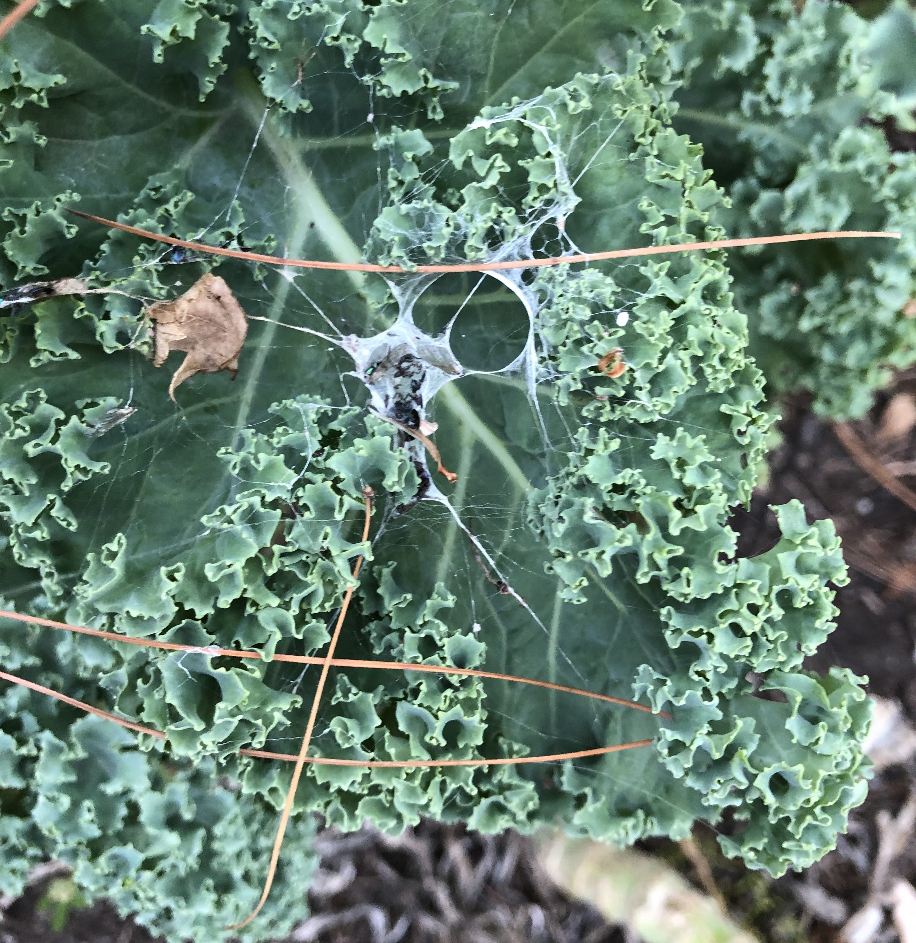 I checked in on the spider that has lived in my kale all summer and while she wasn’t home, a future meal remained, spun in webbing.