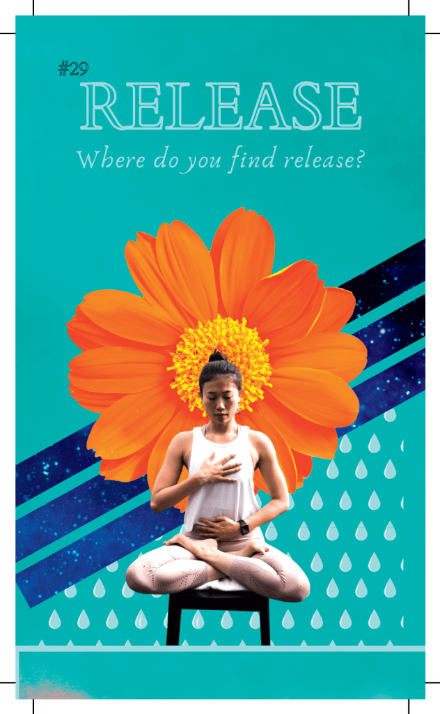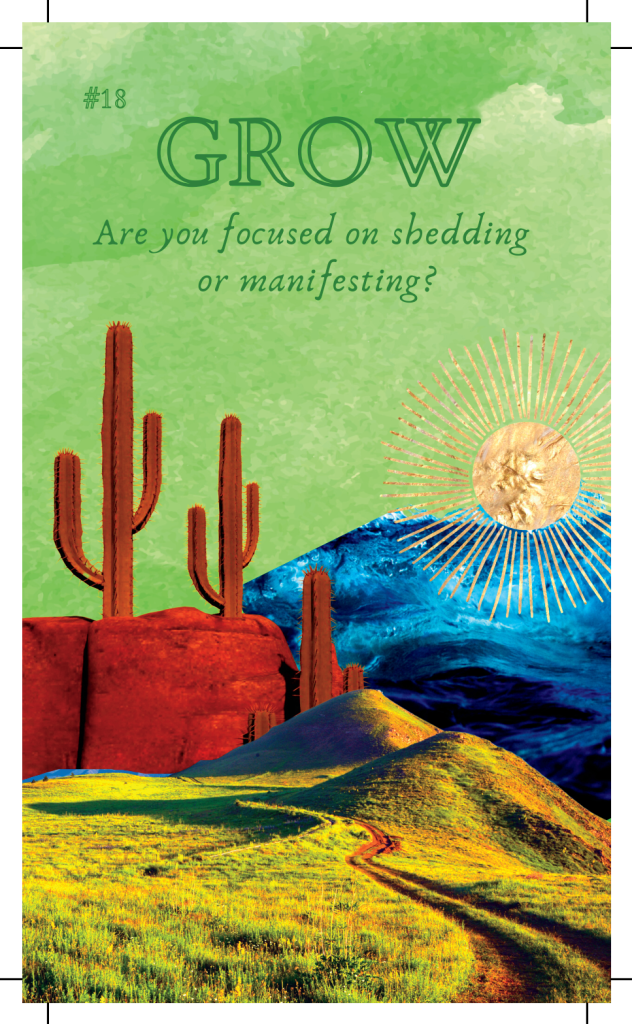 I developed the creative concept, visual system, and illustration for all 52 cards. Each card pairs layered collage artwork with an open-ended prompt, organized across twelve thematic categories including Harvest, Cultivate, Release, Connect, Grow, and Glow. The collage style was intentional: reflecting the multi-faceted, sometimes contradictory nature of being human, while the color coding creates a visual system that makes the deck intuitive to navigate.